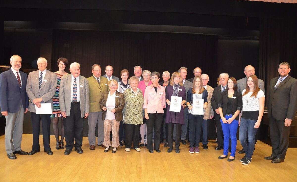 Viele klingende Jahre: Bei der Ehrungsmatinee des Bezirks Neckar-Erms im Chorverband Ludwig Uhland hoben Landrat Thomas Reumann (links) und Metzingens Oberbürgermeister Dr. Ulrich Fiedler (rechts) die Bedeutung des Chorgesangs hervor. In der Mitte mit grünlicher Bluse Doris Ausländer, die schon seit 65 Jahren im Chor singt.
