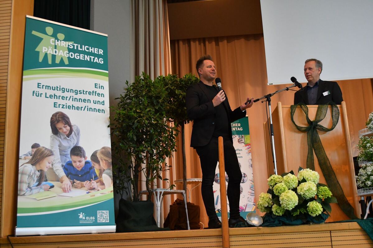 David Reger (links), Geschäftsführer von NEURA Robotics Metzingen, im Gespräch mit Dr. Paul-Gerhard Roller, Vorsitzender der Evangelischen Lehrer- und Erziehergemeinschaft in Württemberg (ELEG).