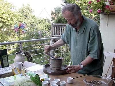 Schweißtreibende Angelegenheit: August Huber mahlt das Sieben-Kräuter-Pulver in der Steinmühle mit Muskelkraft.