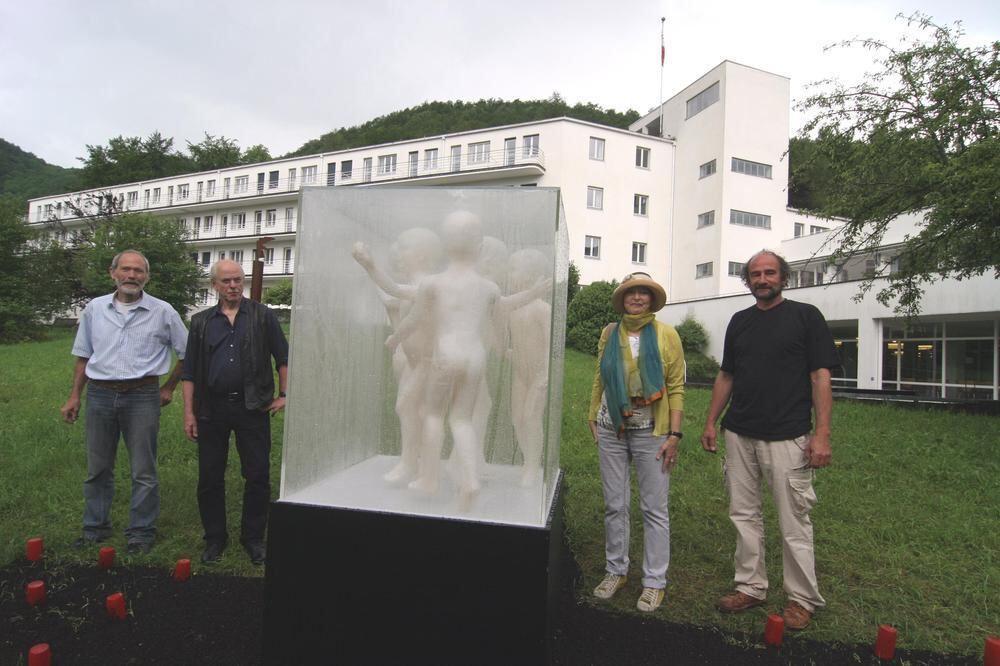 »ausgesetzt« heißt das Objekt von Gisela Rohnke, um das herum sich die Künstler Jochen Meyer (links), Peter Barth, Dr. Nurhan Sidal und Martin Bürck aufgestellt haben. Die fünf haben Werke für die Ausstellung »Zeit/Raum - Jahrhunderthaus« im »Haus auf der Alb« in Bad Urach geschaffen.