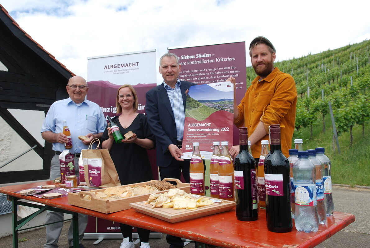 METZINGEN/MÜNSINGEN. Zum zweiten Mal ist angerichtet: Milch, Käse, Eier, Linsen und ganz neu Kartoffeln von der Alb, Mehl aus Lichtenstein, Wein aus Metzingen und Neuffen und so vieles mehr. Entlang der Albgemacht-Genusswanderung am Sonntag, 12. Juni, im Neuhäuser Weinberg oberhalb der Äußeren Kelter. »2020 und 2021 wollten wir, jetzt schaffen wir es«, spielt Rainer Striebel aus der Geschäftsstelle des Biosphärengebiets Schwäbische Alb in Münsingen auf die pandemiebedingte Pause an. »Probieren, einkaufen, wandern« hieß es schon 2019 bei der Erstauflage der Genusswanderung, es ist auch am Sonntag wieder angesagt. Wie damals hoffen die Albgemacht-Macher auch jetzt auf 2 000 bis 3 000 Besucher. Die Wettervorhersage macht Mut, ist gut.