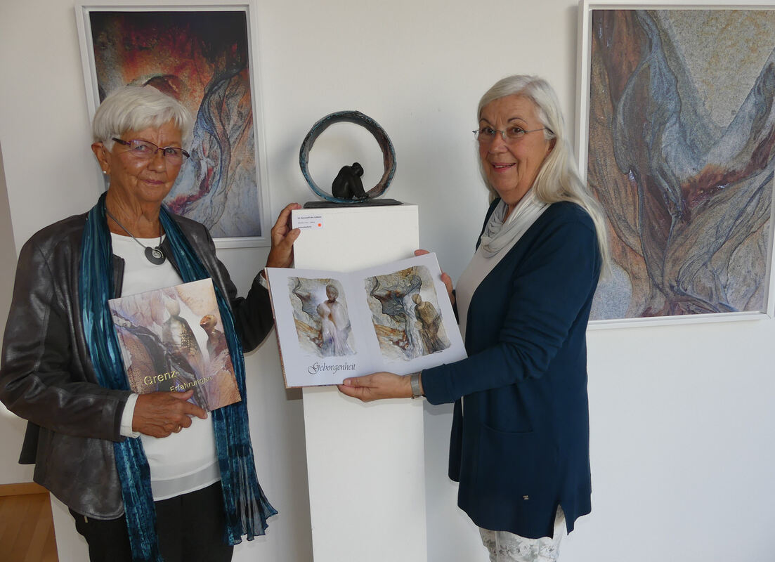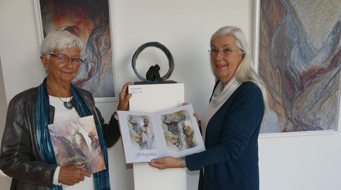Mechthild Matthes (links) und Kara Voss-Conrad vor ihren Werken aus Rauchbrand-Keramik, Sandbilderkunst und Acrylmalerei in der Ausstellung »Grenz-Erfahrungen« im Rathaus Wannweil, die noch bis 26. November zu sehen sind. FOTO: SANDER