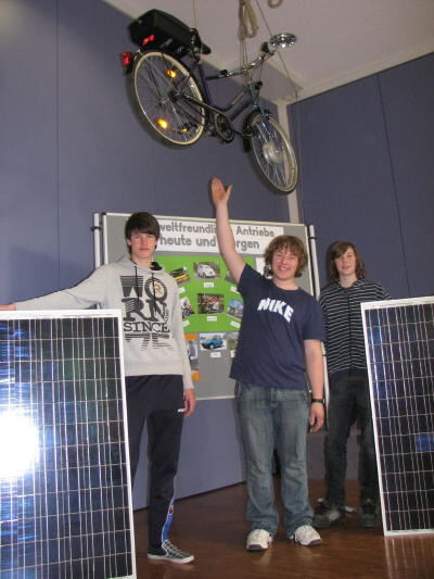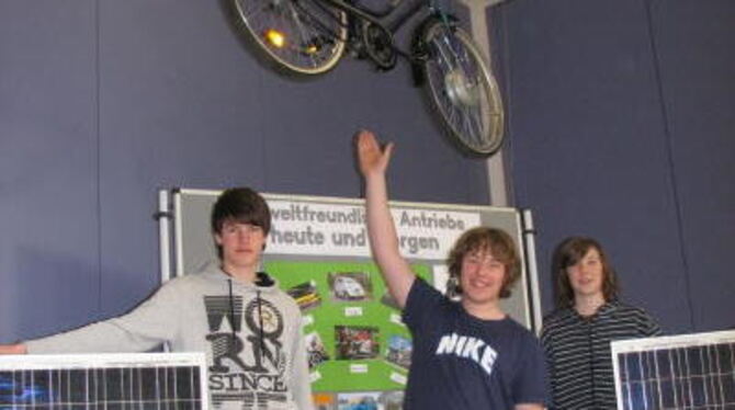 Justus Mattedi, René Bender und Patrick Hätinger (von links): Über ihnen hängt das erste Fahrrad, bei dem sie einen Elektromotor eingebaut haben. Und zwei halten die Paneele in der Hand, die den Sonnenstrom für die Solartankstelle liefern sollen.