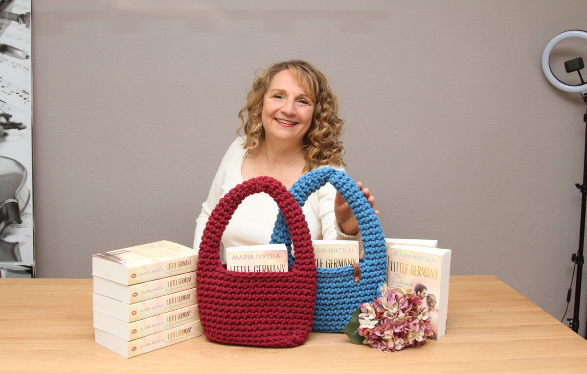 Besteller-Autorin Maria Nikolai zwischen Band 1 und 2 der Little-Germany-Dilogie und zwei gehäkelten Taschen, in die die Bücher genau reinpassen.