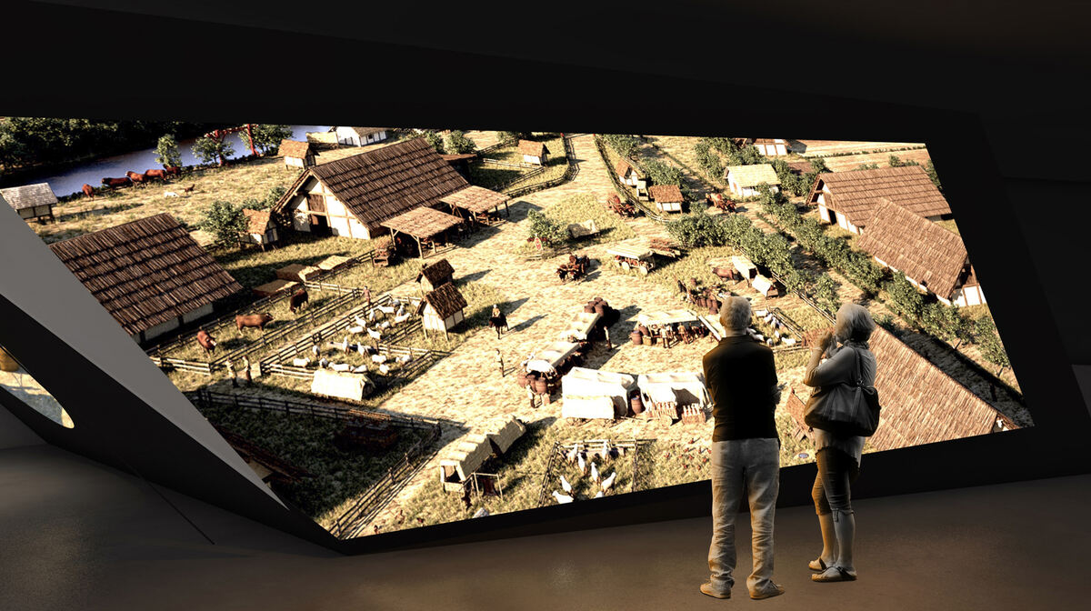Zu Fuß geht’s von dort aus auch für Besucher, die mit Bussen angereist sind, zum eigentlichen Kelten-Erlebniszentrum mit seinen 3.320 Kubikmetern umbauten Raum (»Es wird von außen kaum wahrgenommen«, so Architekt Ott) und einer Ausstellungsfläche von 350 Quadratmetern. Die geöffnete Seite ist von einer Glasfront geprägt, im Eingangsbereich befindet sich ein Block mit Kiosk und einem integrierten Kassenbereich: »Das Zentrum soll mit möglichst wenig Personal geführt werden«, so der Architekt. Das Gebäude selbst sei zwar in seiner Wuchtigkeit reduziert und nehme sich, in die Landschaft eingepasst, auch zurück. Inhaltlich sei es aber hochwertig ausgestattet, wie die Vertreter von Studio klv aus Berlin bei der Videokonferenz anschaulich darlegten.