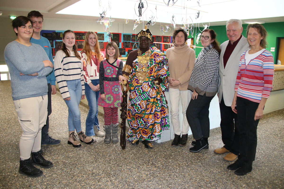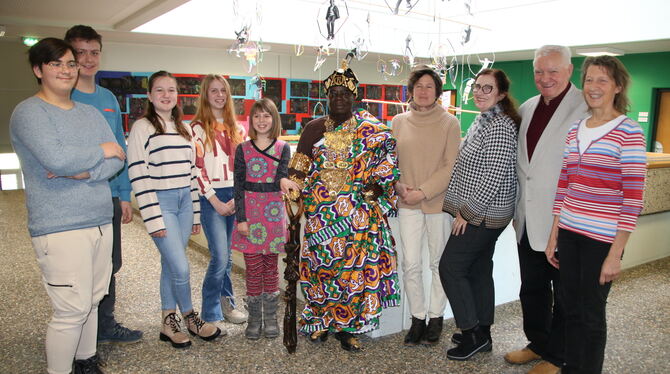 König Céphas Bansah in vollem Ornat, umgeben von den Schülern der Afrika AG des Graf-Eberhard-Gymnasiums, seiner Frau Gabriele, den Lehrerinnen Ilse Beck und Silvie Falk sowie Franz Gsodam, Initiatior des Besuchs. FOTO: OECHSNER