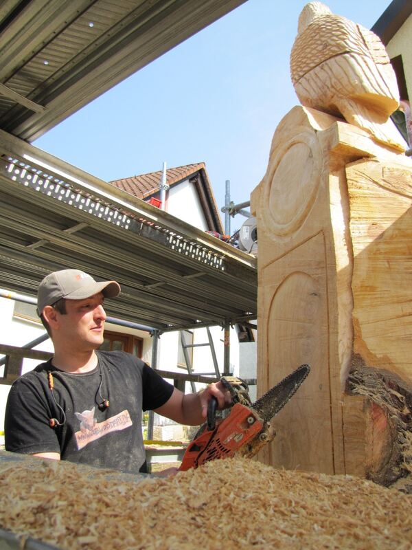 Der Walddorfhäslacher Skulpteur Christian Beck formt eine Uhr aus Holz, die auf dem Grundstück Hauptstraße 29 in Walddorf steht und an ein langjähriges Fachgeschäft nebenan erinnert.