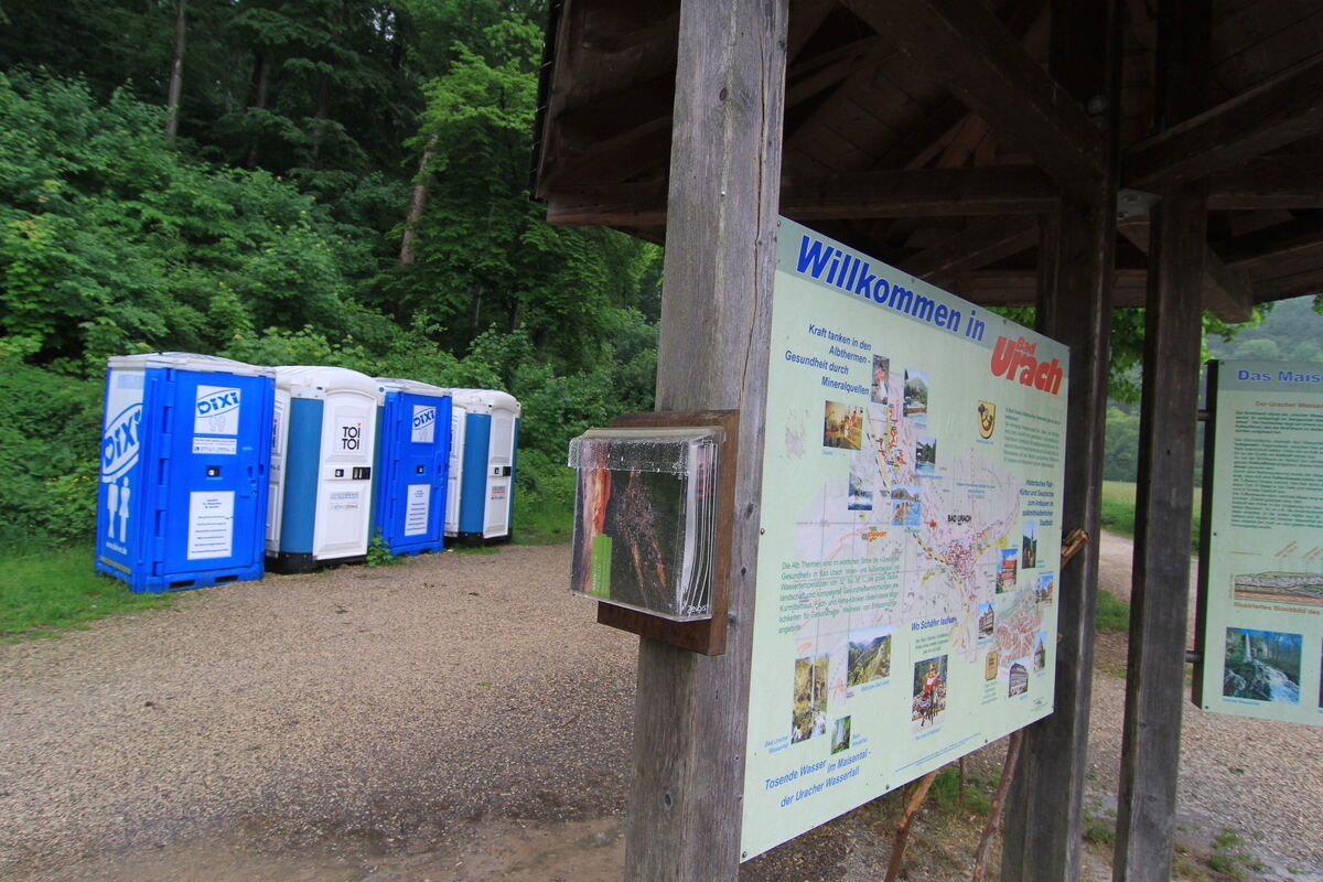 Schick geht anders: Die provisorische Toiletten-Anlage aus Dixi- und Toi-Toi-Klohäuschen auf dem Parkplatz Maisental in Bad Urach soll durch ein solides Gebäude ersetzt werden. Kostenpunkt: rund 130 000 Euro. FOTO: FINK