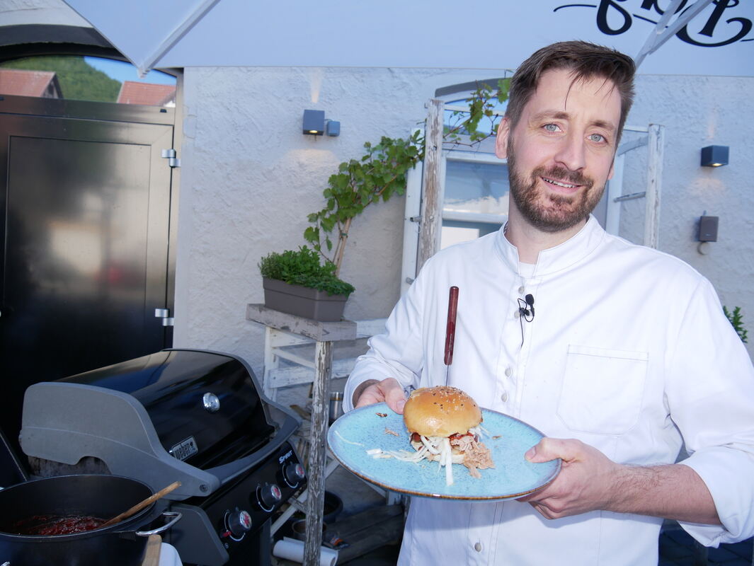 Der Herr des Wilden Mannes: Michael Bischoff präsentiert einen Klassiker der Barbecue-Küche – einen Pulled Pork Burger. FOTOS: FINK