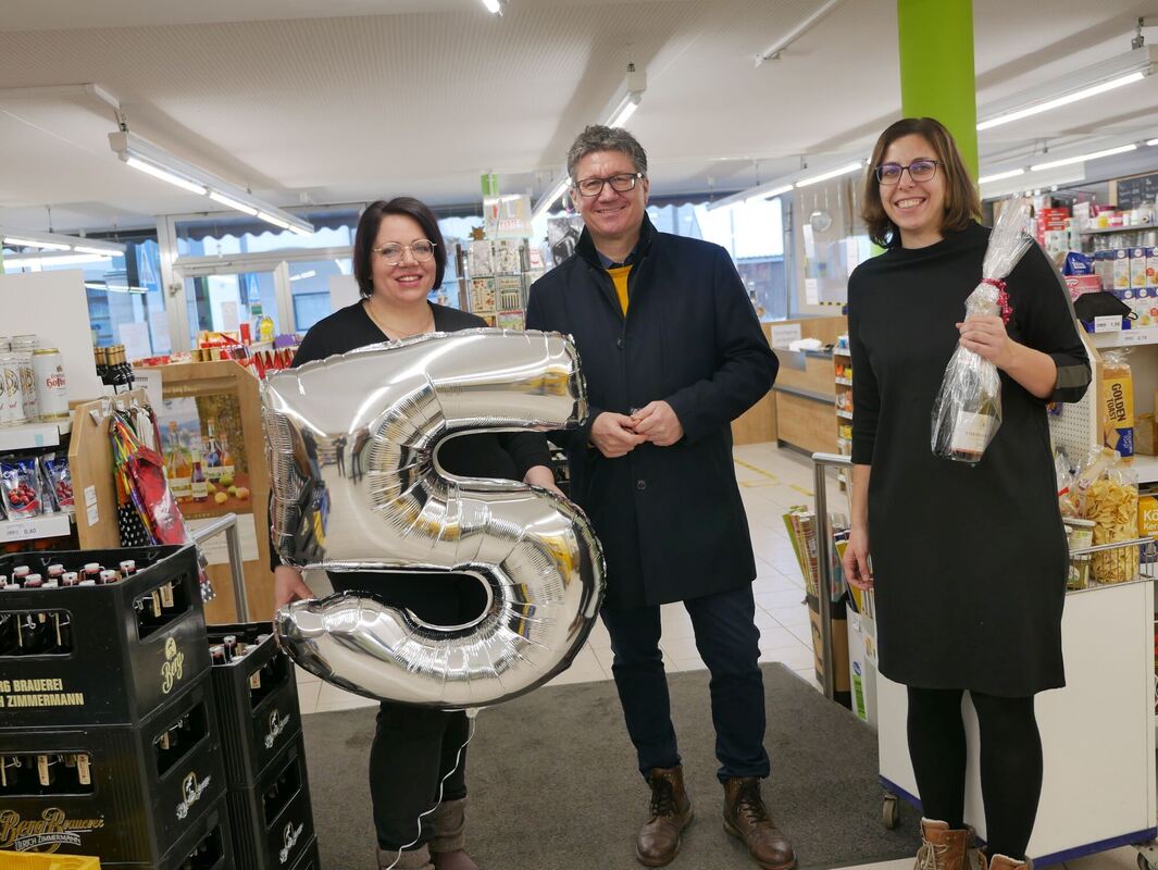 Corinna Kroh, Bürgermeister Siegmund Ganser und Carina Gleß stehen mit insgesamt rund 250 Genossinnen und Genossen hinter der mittlerweile fünfjährigen Erfolgsgeschichte des Hülbener Dorfladens. FOTO: LEISTER