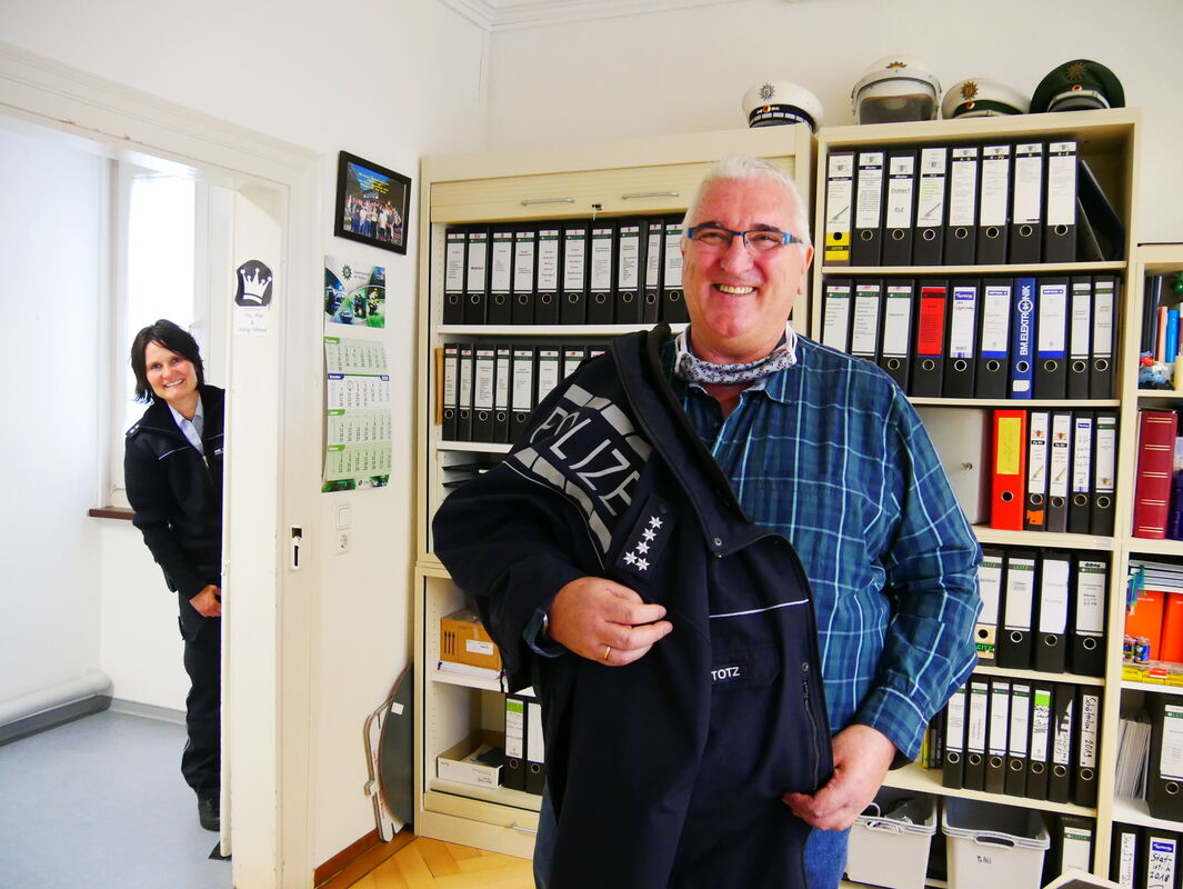 Zum 1. Januar 2021 wird Arthur Stotz seine Uniform endgültig ausziehen, er geht in Pension. Die fünf silbernen Sternchen an der Schulterklappe der Uniform des Ersten Polizeihauptkommissars stehen für den höchsten Dienstgrad des gehobenen Dienstes. Getragen hat sie der 61-Jährige schon seit Monaten nicht mehr: Am 30. Juli verletzte er sich bei einem Rad-Unfall schwer. Zum Gespräch in seinem Büro im Uracher Polizeipostens kam er deshalb in Zivil. Seine Nachfolgerin (im Hintergrund) ist Polizeioberkommissarin Stephanie Anhorn. FOTOS: FINK