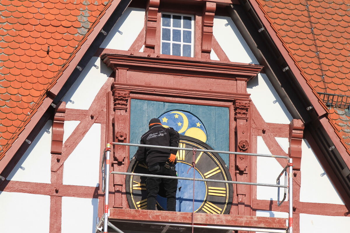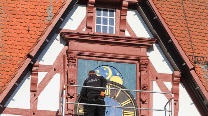 Die Uracher Rathausuhr am 28. Februar – dem Tag, an dem sie Zimmermeister Hans Schmid zur Sanierung ausbaut.