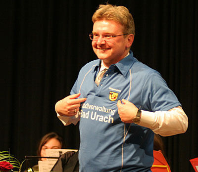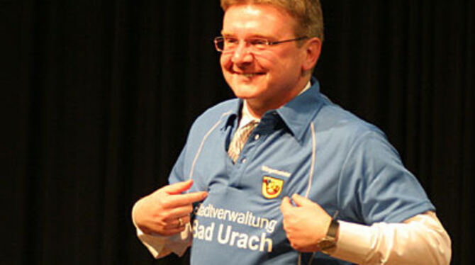 Elmar Rebmann, der neue Bürgermeister von Bad Urach, staunte nicht schlecht, als ihm der Personalratsvorsitzende Michael Theisselmann ein Trikot mit der Rückennummer 1 überreichte. GEA-FOTO: FINK