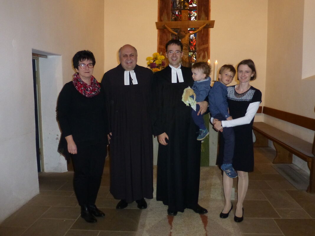 Investitur von Grabenstettens neuem Pfarrer Matthias Arnold (Mitte) mit Dekan Michael Karwounopoulos, der Vorsitzenden des Kirchengemeinderats Karin Bauer sowie Arnolds Frau Marie-Lisa und den Kindern Elias und Emanuel. FOTO: KIRCHE