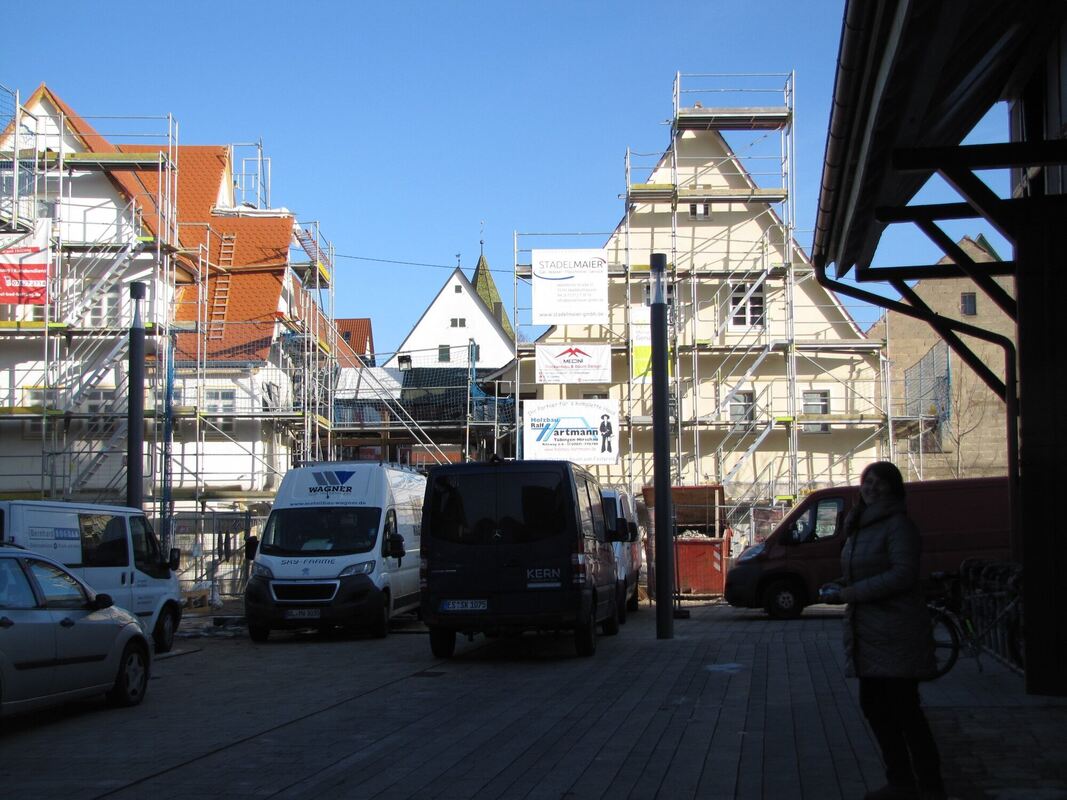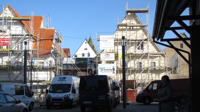 Durch die Baugerüste ist der »neue Ochsen« mit seinen beiden Gebäudeteilen schon zu erkenn: Bis Ende des Jahres soll alles fertig restauriert sein.