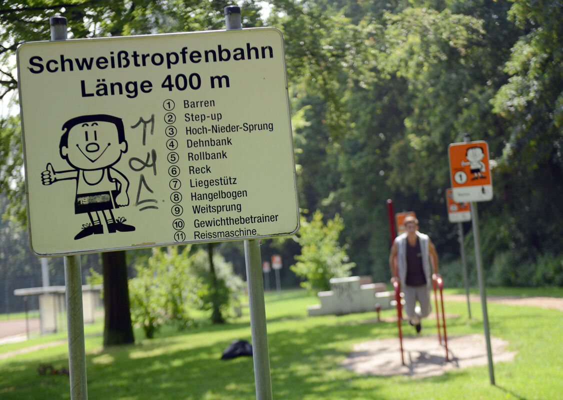 Kevin Rys trainiert in Münster auf Deutschlands erstem Trimm-dich-Pfad. Die 1962 als Vorläufer der Trimm-dich-Pfade vorgestellte »Schweißtropfbahn« wird auch heute noch benutzt. »Trimmy« warb mit hochgerecktem Daumen für mehr Bewegung. FOTO: SEIDEL/DPA