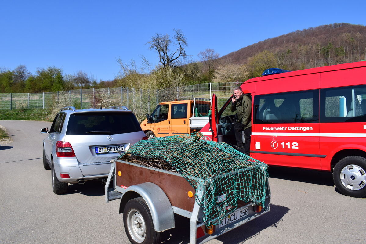Mit dem Mikro für die Lautsprecheranlage in der Hand begrüßte Dettingens Bürgermeister Hillert die Menschen, die auf dem Häckselplatz ihr Grüngut anlieferten, auch vom Feuerwehrauto aus. Die verschärften Regeln zum Schutz vor Corona sind am Eingang sichtbar. Michael Wetzel vom Bauhof kontrollierte den Sicherheitsabstand unter anderem mit dem Meterstab.