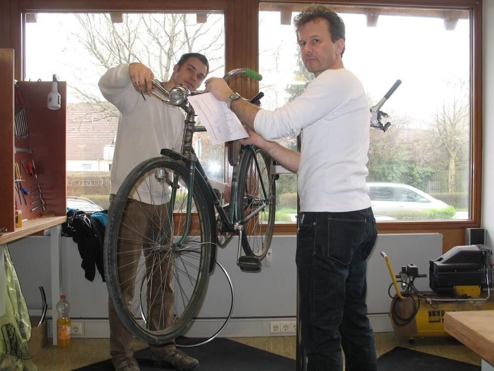 Verkauf und Reparatur von Fahrrädern ist Mittel zum Zweck: Die Fahrradwerkstatt der Bruderhaus-Diakonie, hier mit dem Werkstattleiter Daniel Albrich (rechts) und dem Zweiradmechaniker Johann Link, ist genauso wie der im gleichen Gebäude untergebrachte Gebrauchtwarenmarkt der MAI ein gemeinnütziges Unternehmen.
