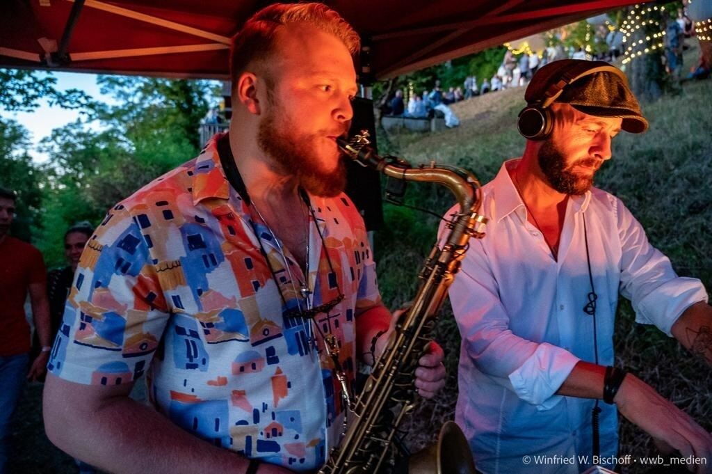 METZINGEN. Superstimmung am Samstagabend auf dem Metzinger Weinberg: 800 bis 1 000 Leute saßen tiefenentspannt am Hang beim Herlishäusle zusammen. In der Hand ein kühles Glas Wein oder einen Cocktail, lauschten sie der lockeren Musik von DJ Thomas Raudnitzky und Saxofonist Fabian Martin, die ein kleines Zeltdach gegen die Sonne hatten. »Der Weinberg war proppenvoll«, freut sich Constanze Hakenholt von der Metzingen Marketing und Tourismus GmbH (MMT), die den Sommerabend im Weinberg am Samstag zum zweiten Mal organisiert hatte. Ein prachtvoller Sonnenuntergang krönte den Abend, der im Gegensatz zur Erstauflage vor einem Jahr ganz ohne Corona-Beschränkungen verlief.