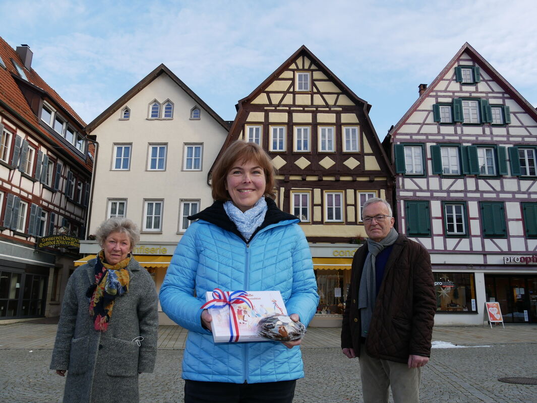 Das Traditions-Café Ruf am Uracher Marktplatz schließt. Die Chefin Katherina Höner (Mitte) hört aus gesundheitlichen Gründen auf. In ihren Händen hält sie ein Früchtebrot und eine Schachtel Schäfles-Pralinen – eine Spezialität mit Himbeer-Ganache-Füllung. Nicht nur in Krankheitszeiten standen ihre Eltern Margarete und Franz-Josef an ihrer Seite. FOTO: FINK