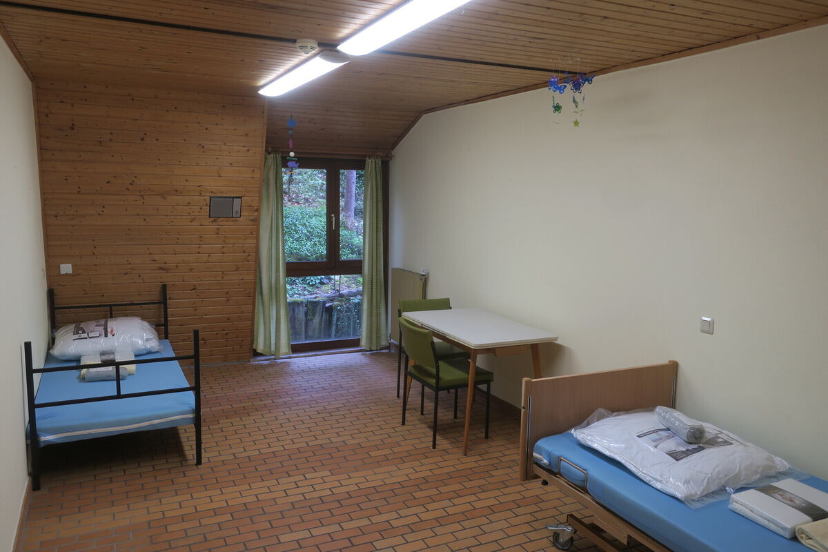Das »Haus Geborgenheit« der EBK, ehemals ein Pflegeheim, wird für Geflüchtete aus der Ukraine genutzt. Hier (links) eines der Zimmer, die immer mit zwei Betten bestückt sind, über einen Tisch verfügen sowie jeweils ein kleines Bad haben. Mithilfe eines Caterers kann auch der alte Essenssaal wiederbelebt und vermutlich im Schichtbetrieb genutzt werden. FOTOS: MERKLE