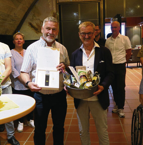Hillert freute sich, dass die Räte und seine Mitarbeiter ihn würdigten: »Ich möchte es aber nicht zu hoch hängen.« Ihn habe am meisten gefreut, dass die Sitzung wieder im Schlössle und nicht in der Schillerhalle stattfinden konnte. Es habe sich in den 20 Jahren einiges verändert: »Damals habe ich als Bürgermeister noch gesagt, in welche Richtung wir gehen.« Heute gäben gesetzliche Regelungen ihm und seinen Kollegen nur wenig Spielraum. »Wir hecheln unseren gesetzlichen Aufgaben hinterher«, sagte Hillert. (GEA)Michael Hillert (vorne links) ist seit 20 Jahren als Dettinger Bürgermeister im Dienst. Rolf Hägele (vorne rechts) hielt am Donnerstagabend die Ansprache. (pm)
