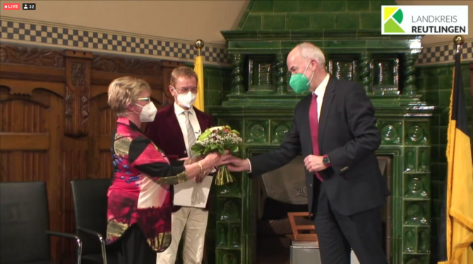 Gekämpft hat Rolf Hägele für die Wiederinbetriebnahme der Ermstalbahn, ein Freudenfest, als am 31. Juli 1999 der erste Zug die Fahrt wiederaufgenommen hatte, wie der Apotheker selbst betonte. Er war und ist aber nicht nur im Aufsichtsrat der Neckar-Alb-Bahn, sondern auch stellvertretender Vorsitzender im Aufsichtsrat der Kreiskliniken. »Sie sind überall zu finden, wo kommunalpolitische Tätigkeit wichtig ist – schwäbisch, leidenschaftlich, kämpferisch, unbestechlich, in der Sache knallhart, aber nie persönlich geworden«, lobte Reumann. Dann trugen Landes-, Bundes- und Europapolitiker online ehrende Worte zu der Feierstunde bei. Dettingens Bürgermeister Michael Hillert, der neben Helga und Rolf Hägele in der guten Stube des Landratsamts anwesend war, sagte: »Dass Dettingen heute eine lebens- und liebenswerte Gemeinde ist, das ist auch Rolf Hägele zu verdanken.« (GEA)