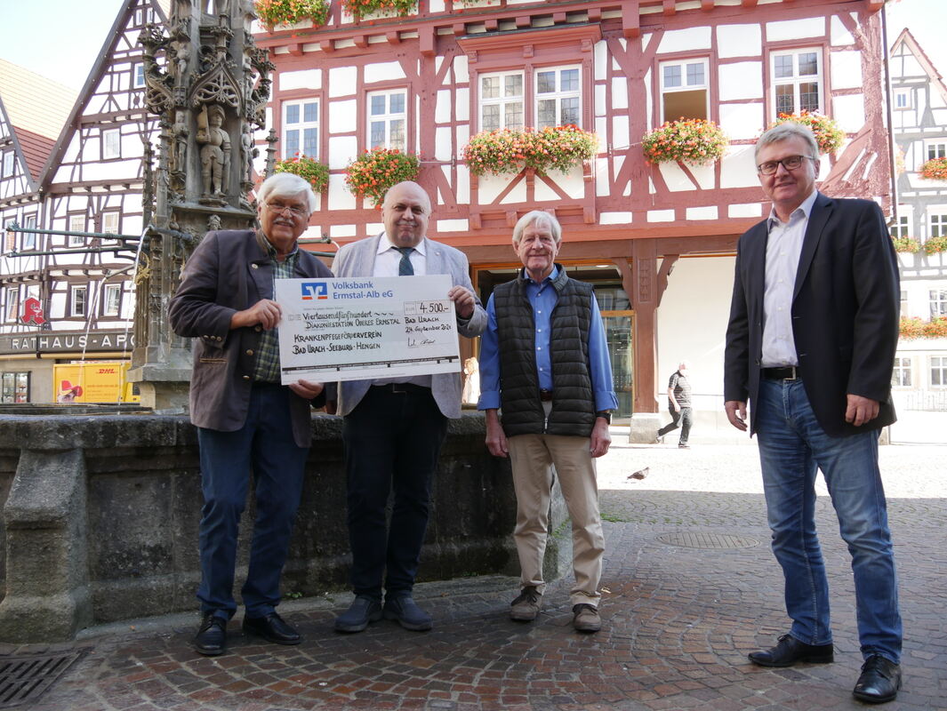 BAD URACH. Der Krankenpflegeförderverein Bad Urach-Seeburg-Hengen hat 4.500 Euro für die Diakoniestation Oberes Ermstal-Alb gespendet. Eberhard Abel, Vorsitzender des Vereins, überreichte den symbolischen Scheck im Beisein von Bürgermeister Elmar Rebmann an Dekan Michael Karwounopoulos als Vertreter der Diakoniestation. Das Geld kommt dem Projekt »Zeitintensive Betreuung« (ZiB) zugute, das sich der Versorgung Demenzkranker widmet. Ins Leben gerufen haben es die Diakoniestation Oberes Ermstal-Alb und Diakoniegesellschaft Münsinger Alb. Mit dem Geld vom Förderverein werden Leistungen finanziert, die nicht von den Kassen gedeckt werden.
