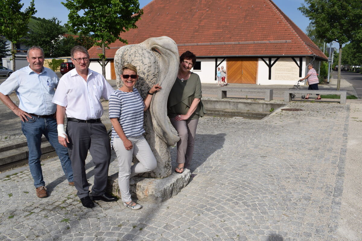 Dorffest in Neuhausen: Das Festkomitee mit (von links) Wolfgang Fritz und Roland Forster vom Kelternverein und vom KK-Schützenverein sowie Gemeinderätin Sabine Huber und Ortsvorsteherin Lilli Reusch beim »Roten Pferd« des Bildhauers Konrad Schlipf. Im Hintergrund die Innere Kelter, wo auch das Festzelt ausgestellt wird. Die Kelternstraße ist am Wochenende gesperrt. FOTO: FÜSSEL