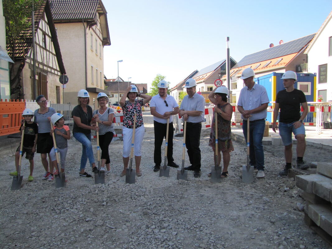 Walddorfhäslachs Bürgermeisterin Silke Höflinger (Sechste von links) mit anderen Akteuren beim Spatenstich zur Sanierung der Haidlinsgasse