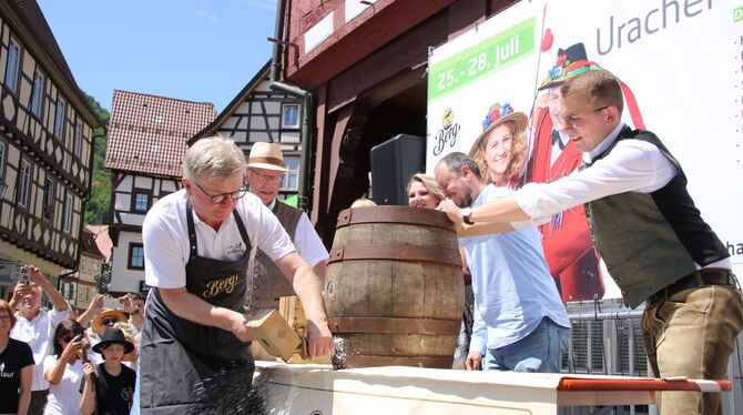 Drei Schläge und das Bergbier fließt: Bürgermeister Elmar Rebmann beim Fassanstich des Schäferlaufbieres