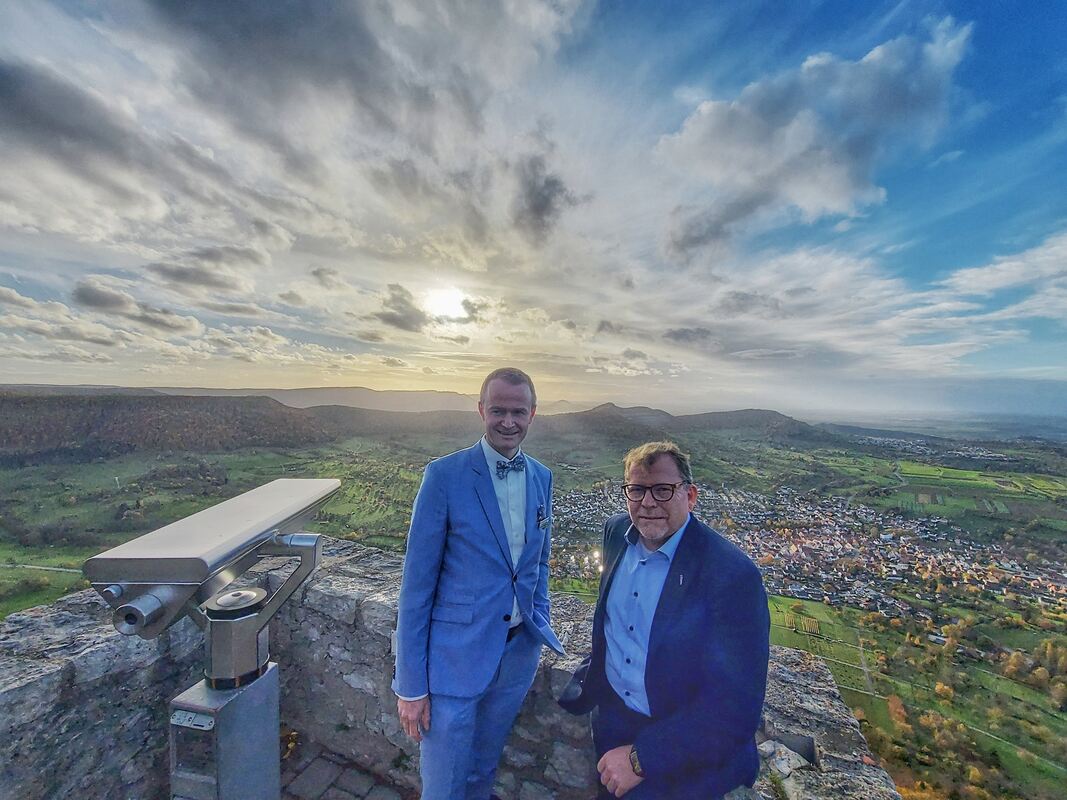 Brauchen kein Fernrohr, um Weitsicht zu zeigen: Louis Schumann (links), der Geschäftsführer des Schwäbische Alb Tourismusverbands (SAT), mit dem Vorsitzenden Mike Münzing. Die Touristiker trafen sich auf dem Hohenneuffen. FOTO: FINK