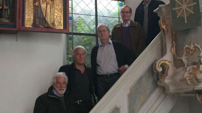 Horst Putsch, Michael Lang, Ernst Wandel und Otto Bauer (von links) haben ein Festbuch zum Kirchenjubiläum geschrieben. Hier sind sie mit Pfarrer Klaus-Dieter Rieger auf der barocken Kanzel zu sehen.