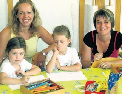 Strahlende Gesichter im frisch gestalteten Kindergarten: Laura und Isabell mit Erzieherin