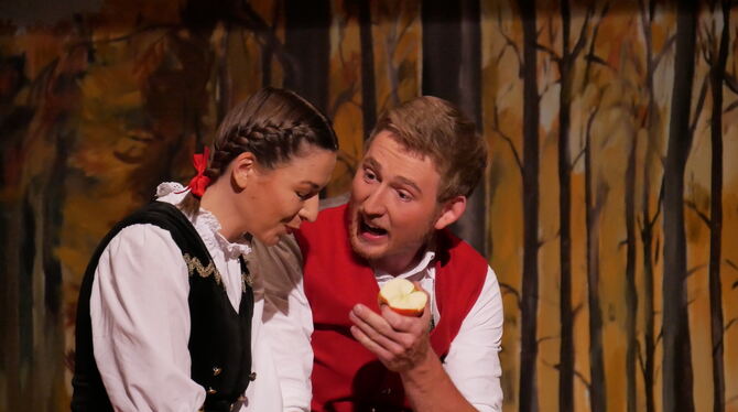 Der Apfel der Versuchung? Schnell ist klar, dass sich Lies und Hannes lieben. Nicht ganz einfach bei ihren Vätern, dem Kirchenbauer und dem Schäferbauer, die sich hier unter dem kritischen Blick des Oberamtmanns herzhaft streiten.