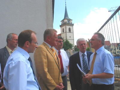 Wirtschaftsminister Ernst Pfister (dritter von links) informierte sich in Metzingen über Projekte der Stadtsanierung, hier im Gespräch mit Otto Jetter von der FDP, dem ersten Bürgermeister Dietmar Bez, dem Sanierungsberater Nikolaus Weber, Oberbürgermeister Dieter Hauswirth und Planungsamtsleiter Konrad Berger.