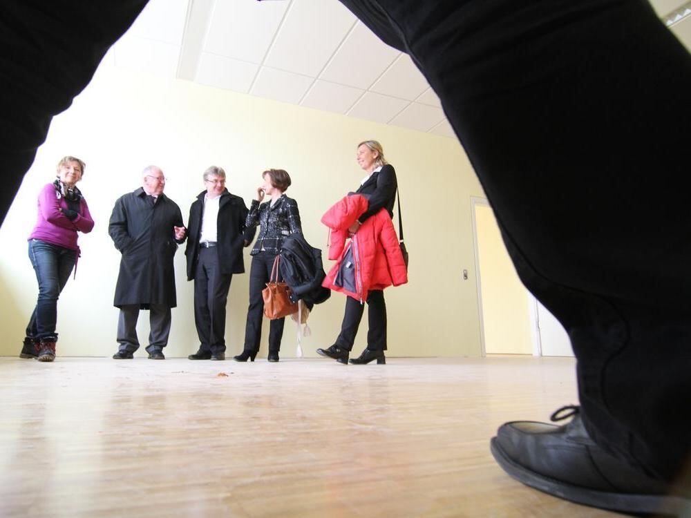 Die Großen schauen sich den Raum an, in dem ab Mitte April die Kleinen schlafen. Die Räume der Wittlinger Tiger-Gruppe besichtigen Cornelia Wahler-Ettwein (links) und Anne Mack (2. von rechts) vom Tagesmütterverein Reutlingen. Mit auf der Baustelle der Wittlinger Ortsvorsteher Konrad Hölz (2. von links), Bürgermeister Elmar Rebmann und Annette Ullrich von der Stadt Bad Urach.