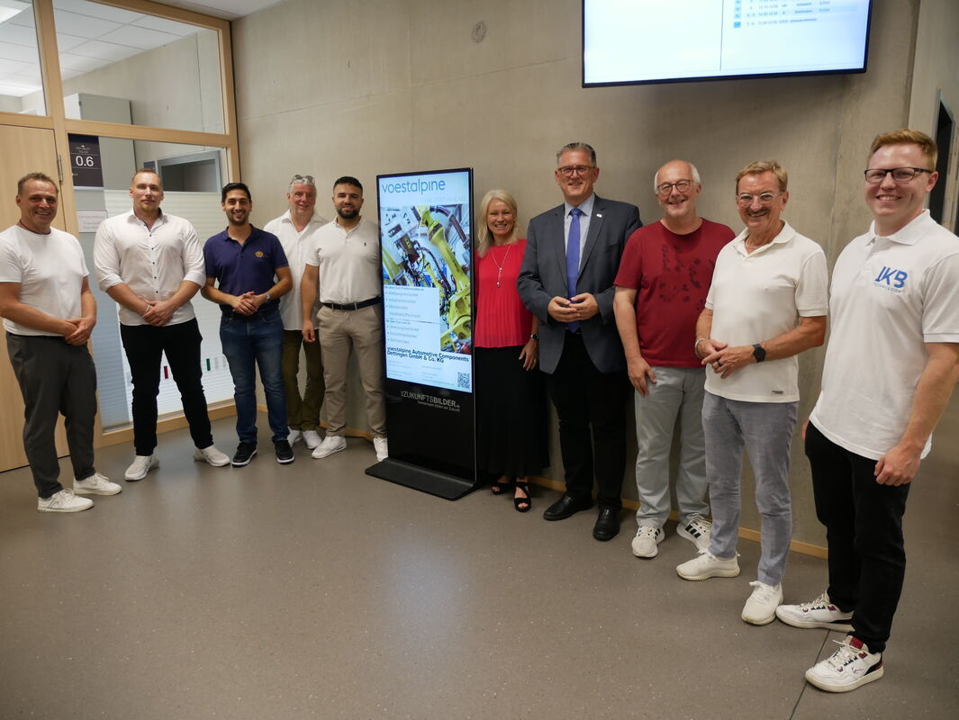 Sowohl die beteiligten Display-Gestalter wie auch Rektorin Kerstin Kreppel und Konrektor Jochen Kuhn (3. von rechts) zeigen sich begeistert von dem Prototypen eines Werbedisplays, über das seit zwei Wochen in der Dettinger Schillerschule Firmen Nachwuchs suchen.
