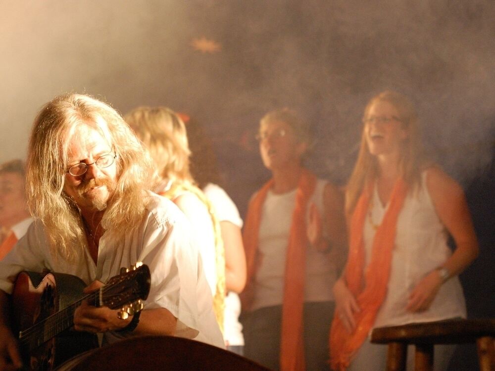 Musik aus dem Nebel: Beim bislang letzten Sommerfest des Kulturvereins »z.B. Glems« im Jahr 2011 waren verschiedene Stilrichtungen zu erleben. Im Bild begleitet Kulturvereins-Vorsitzender Walter Dieterle den Gesang des Glemser Chors Fortissimo an der Gitarre.