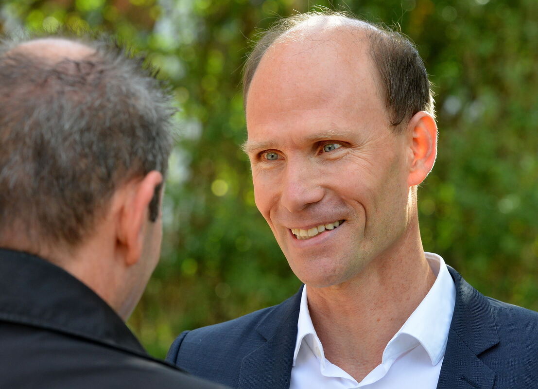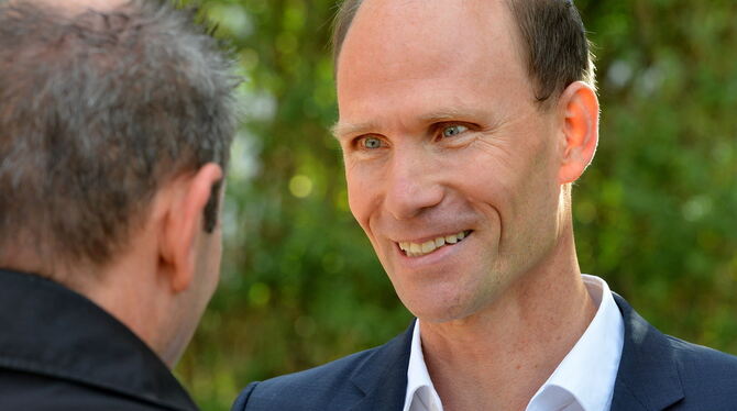 Bürgermeisterkandidat Dr. Niels Joeres traf sich zum Gespräch mit GEA-Redakteur Ralf Rittgeroth auf eigenen Wunsch vor der Johanneskirche in Wannweil, weil dort sein erst wenige Wochen alter Sohn Constantin getauft wurde. FOTO: NIETHAMMER