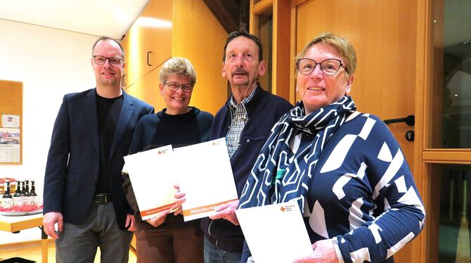 Kreisgeschäftsführer Thomas Födisch (von links), Bereitschaftsleiterin Susanne Buchholz, Ortsvereinsvorsitzender Fritz Schaich und Bereitschaftsmitglied Lore Weiblen. FOTO: VEREIN