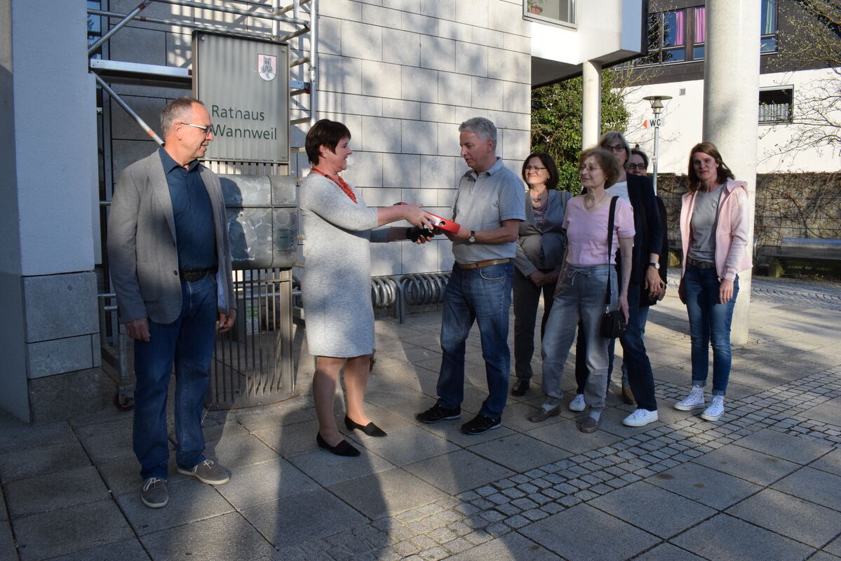 Pünktlich zum Ablauf der gesetzlich vorgeschriebenen Frist überreichten unter anderem Gudrun Keinath, Monika Möller, Helmut Kasper und Frank Hack von der Nachbarschaftsinitiative Bolzplatz die Listen mit den Unterschriften an Wannweils Bürgermeisterin Anette Rösch. Diese nahm sie vor dem Rathaus entgegen und sagte, ab jetzt sei der Gemeinderat Herr des Verfahrens. Dieser beschäftigt sich am Donnerstag, 3. Mai, mit der Angelegenheit und entscheidet auch, ob es zu einem Bürgerentscheid kommt.