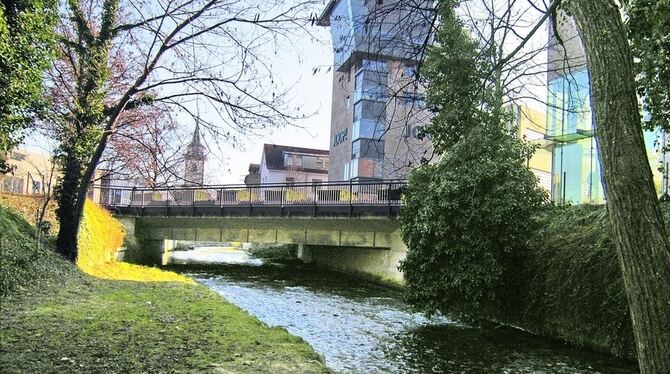 Hier gibt es noch viel zu tun: Im Bereich des Gaenslen-&-Völter-Geländes ist der Fluss noch in weiten Teilen mit alten Industriegebäuden überspannt. Auf lange Sicht soll die Erms aber auch hier wieder ein Bett bekommen, das den ökologischen Erfordernissen eher entspricht. GEA-ARCHIVFOTO: PFIAuf einer Seite für Menschen zugänglich: Die Erms beim Lindenplatz, mitten in der Stadt, mitten im Outlet-Trubel mit Blick auf den Joop-Turm und die Martinskirche – ein Beispiel, wie es sich Stadtplaner noch an vielen Stellen in Metzingen wünschen.