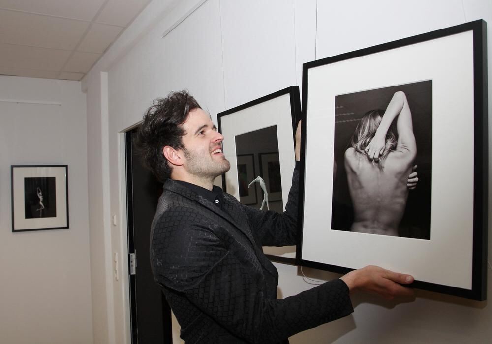 Verrutschen sollten seine Porträts dann doch nicht – Mike Meyer beim Hängen einer seiner Fotografien in der Ausstellung in Hülben. FOTO: KOZJEK