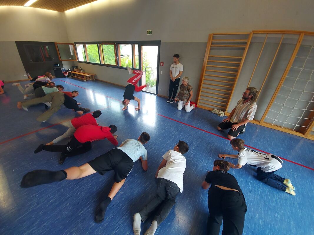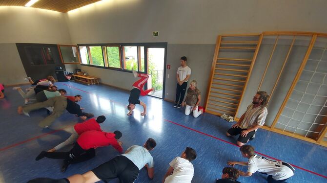 Der Verein zur Förderung von Kindern und Jugendlichen Bad Urach hat 5.000 Euro für einen dreitägigen Breakdance-Workshop mit der Dance Floor Destruction Crew (DDC) aus Schweinfurt lockergemacht. Im Bild (von links) die Breakdance-Profis Philipp und Kriz neben Marion Nagler-Long und Martin Schirmer vom Förderverein. FOTO: FINK