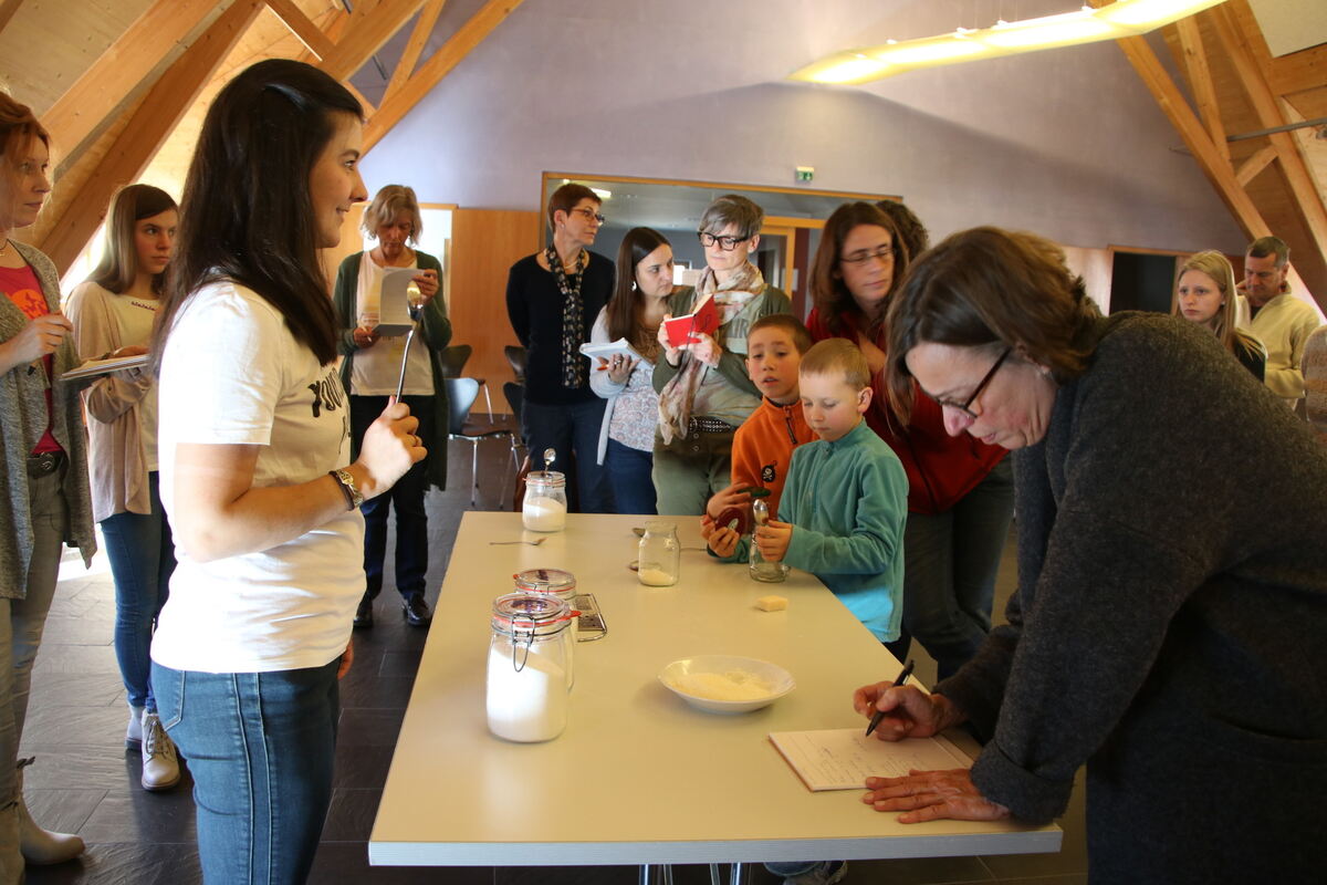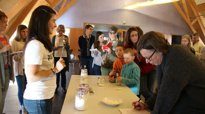 Die Zero-Waste-Aktivistin Aline Pronnet (links) macht in der Uracher Schlossmühle einen Workshop zum Thema Vermeidung von Verpackungsmüll. Am Vorabend hielt sie hier einen Vortrag. Zu beiden Veranstaltungen kamen viele Besucher. FOTO: OECHSNER