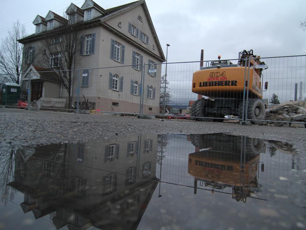 Jetzt noch Pfütze, soll im Juni hier schon ein Biergarten locken: Zwischen der Villa Stuttgarter Straße 34 und dem Bagger ist die Grube für den Wintergarten ausgehoben. Im Hintergrund der Schornstein der früheren Tuchfabrik Gaenslen & Völter.