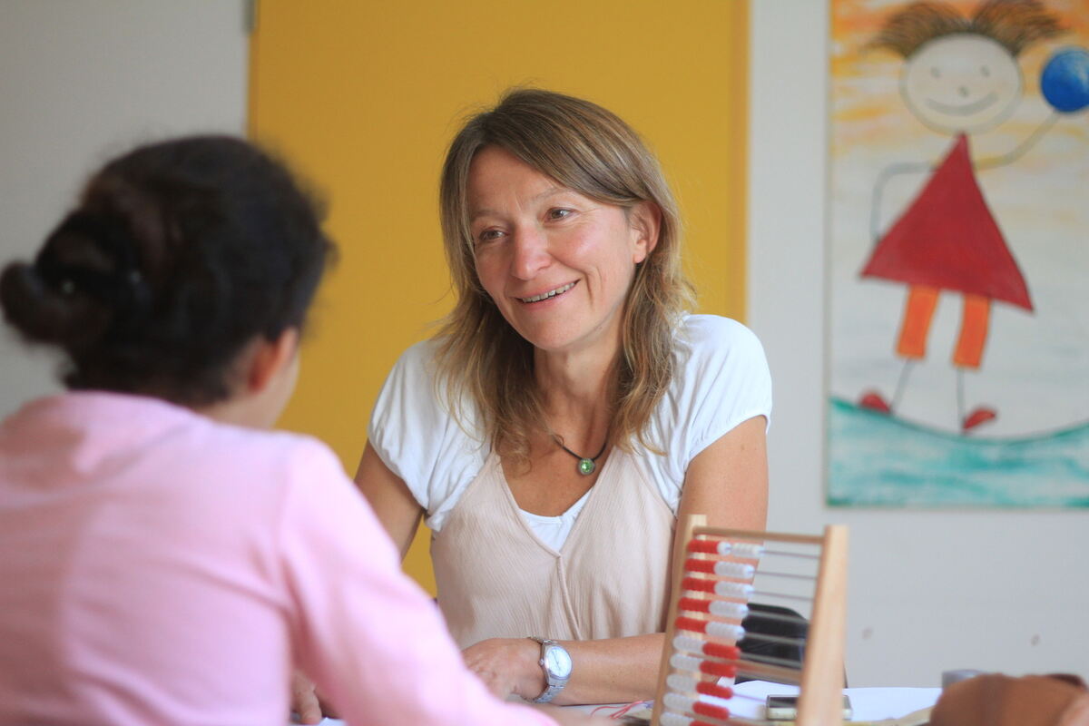 Als Lerntherapeutin hilft Susanne Burkhardt an der Uracher Barbara-Gonzaga-Gemeinschaftsschule Kindern mit Legasthenie und Dyskalkulie. FOTOS: FINK