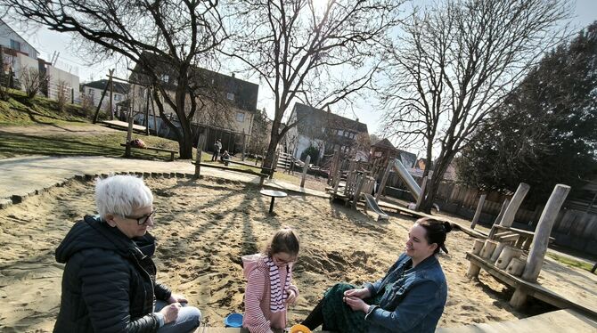 Katharina Härtter (rechts) hat im Wannweiler Gemeinderat für die SPD den Antrag gestellt, am »Feuerwehrspielplatz« eine Kiste für Sandelspielzeug zu installieren. Darüber freut sich nicht nur ihre vierjährige Tochter Luise, die jetzt schon gerne hier spielt, sondern auch ihre Fraktionskollegin Sigrun Franz-Nadelstumpf.