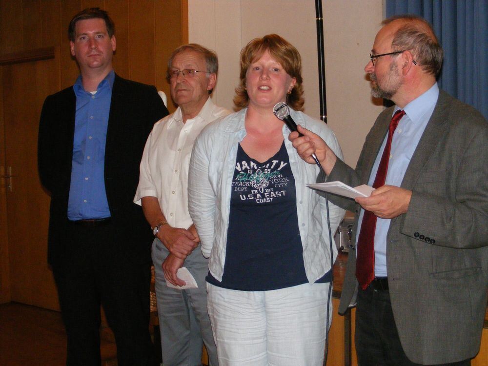 Frieder Leube (rechts) befragt Stephanie Rau (Kirchengemeinderätin Amanduskirche) zur ihrer Sicht auf die aktuelle Kirchensituation. Links von ihr hören Eugen Ruoff und Pfarrer Markus Kettnacker-Prang zu.
